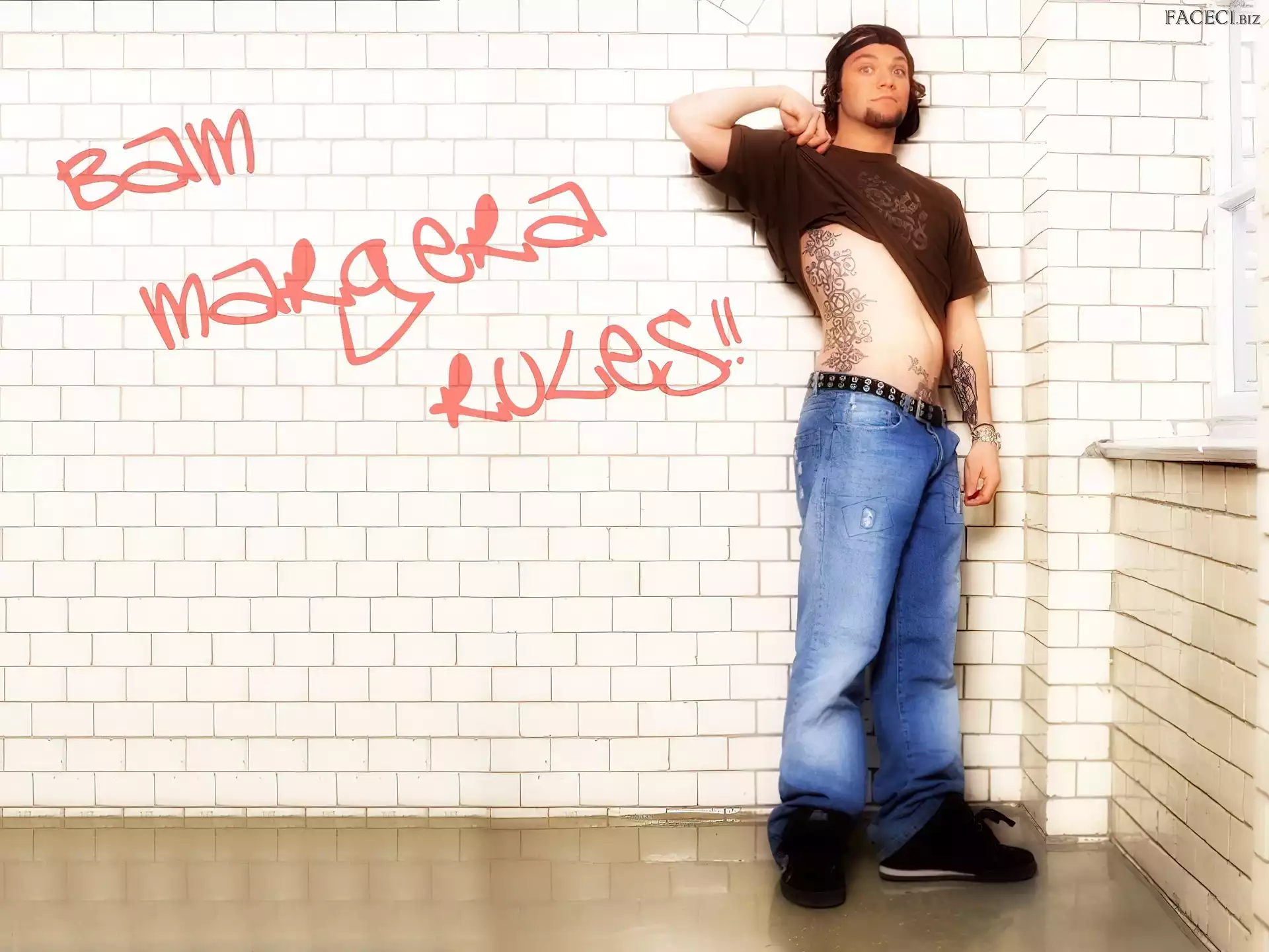 t-shirt, Bam Margera, brązowy okulary, Bam Margera, butelka zegarek, Bam Margera, deskorolka okulary, Bam Margera, twarze kurtka, Bam Margera, rozpięta włosy, Bam Margera, ciemne